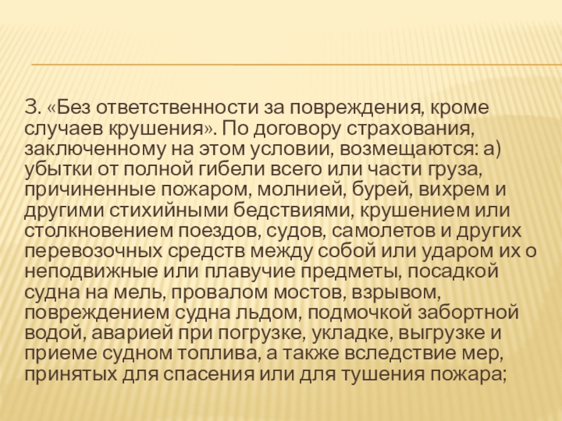 Слайд 173. «Без ответственности за повреждения, кроме случаев крушения». По договору страхования,