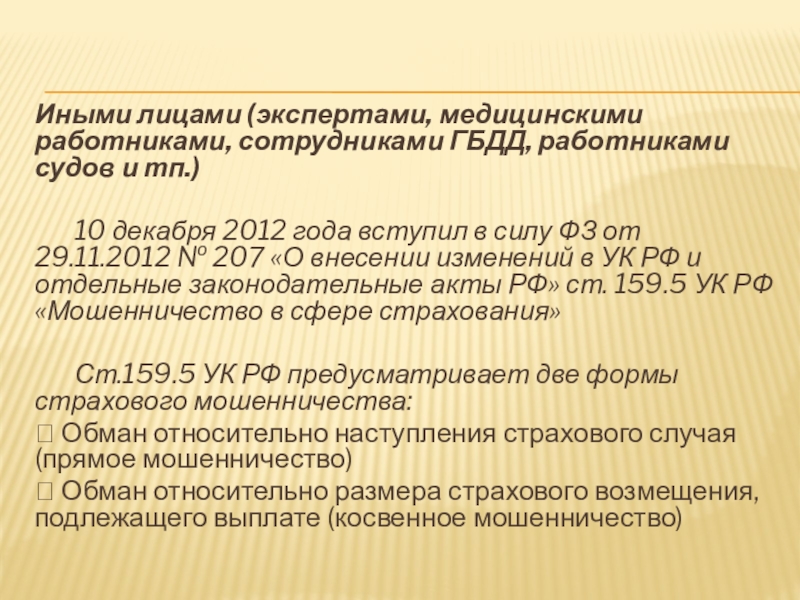 10 декабря 2012 года вступил в силу ФЗ от 29.11.2012 № 207 «О внесении изменений в УК РФ и отдельные законодательные акты РФ» ст. 159.5 УК РФ «Мошенничество в сфере страхования»