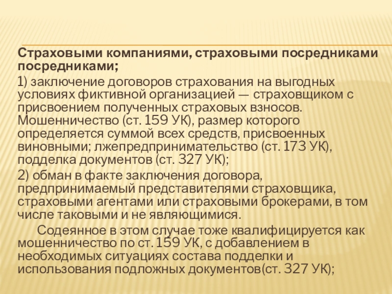 условиях фиктивной организацией — страховщиком с присвоением полученных страховых взносов. Мошенничество (ст. 159 УК), размер которого определяется суммой всех средств, присвоенных виновными; лжепредпринимательство (ст. 173 УК), подделка документов (ст. 327 УК);