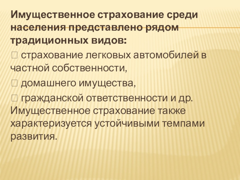 Слайд 29Имущественное страхование среди населения представлено рядом традиционных видов: