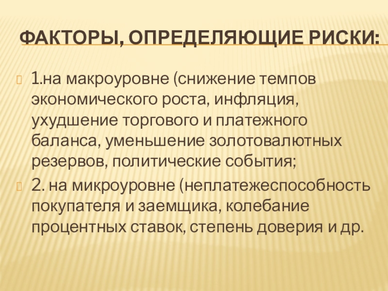 1.на макроуровне (снижение темпов экономического роста, инфляция, ухудшение торгового
