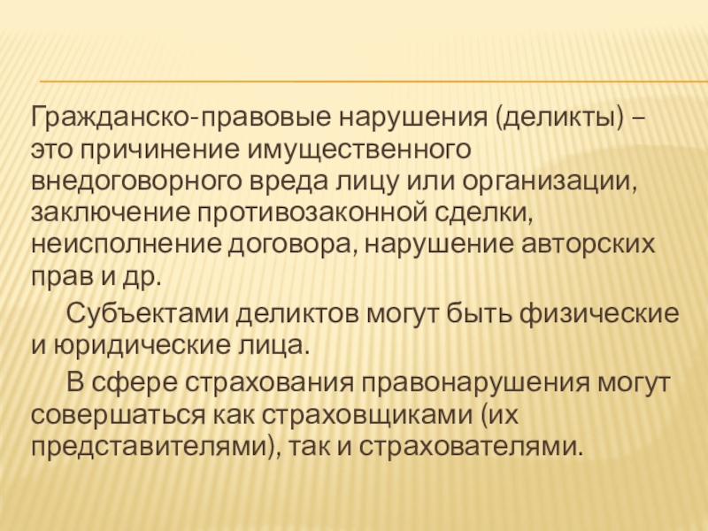 Слайд 36Гражданско-правовые нарушения (деликты) – это причинение имущественного внедоговорного вреда лицу или