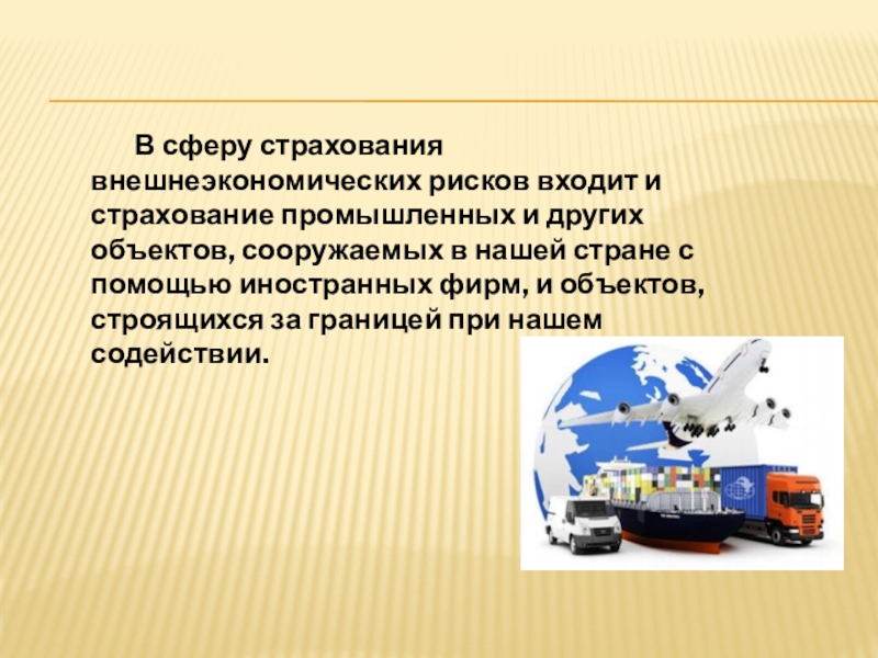 Слайд 6 В сферу страхования внешнеэкономических рисков входит и страхование промышленных и других
