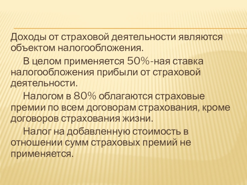 Налогом в 80% облагаются страховые премии по всем договорам страхования, кроме договоров страхования жизни.