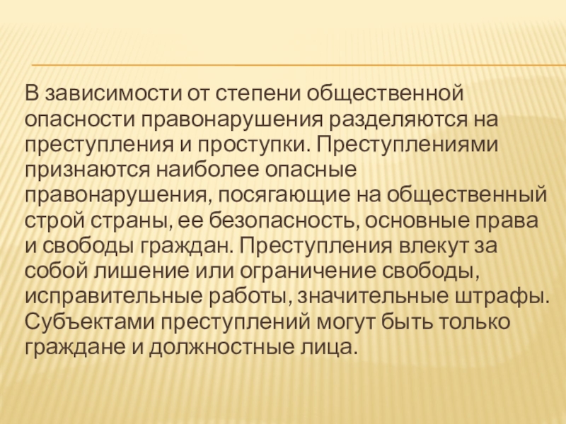 проступки. Преступлениями признаются наиболее опасные правонарушения, посягающие на общественный строй страны, ее безопасность, основные права и свободы граждан. Преступления влекут за собой лишение или ограничение свободы, исправительные работы, значительные штрафы. Субъектами преступлений могут быть только граждане и должностные лица.