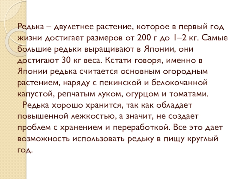 Слайд 2Редька – двулетнее растение, которое в первый год жизни достигает размеров