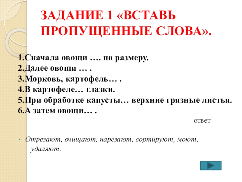 ЗАДАНИЕ 1 «ВСТАВЬ ПРОПУЩЕННЫЕ СЛОВА». 1.Сначала овощи …. по размеру.2.Далее овощи … .3.Морковь, картофель… .4.В картофеле…