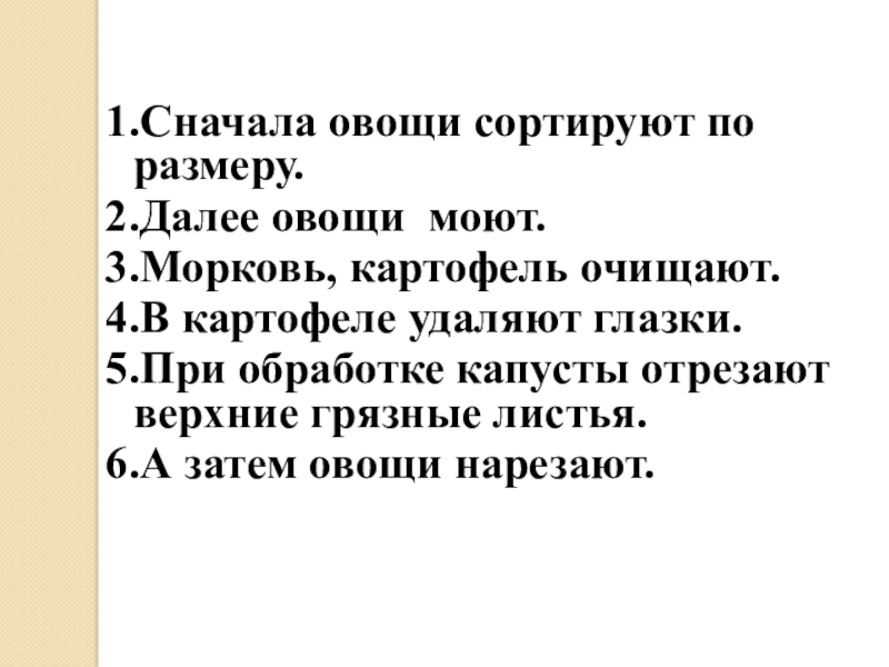1.Сначала овощи сортируют по размеру.2.Далее овощи моют.3.Морковь, картофель очищают.4.В картофеле удаляют глазки.5.При обработке капусты отрезают верхние грязные
