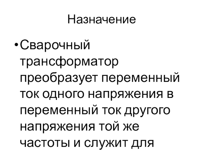 Назначение Сварочный трансформатор преобразует переменный ток одного напряжения в переменный ток другого напряжения той же частоты и