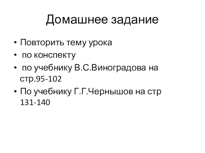 Домашнее заданиеПовторить тему урока по конспекту по учебнику В.С.Виноградова на стр.95-102По учебнику Г.Г.Чернышов на стр 131-140