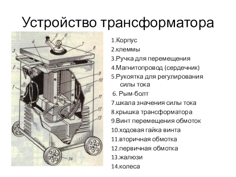 Устройство трансформатора 1.Корпус 2.клеммы 3.Ручка для перемещения 4.Магнитопровод (сердечник)5.Рукоятка для регулирования силы тока 6. Рым-болт7.шкала значения силы