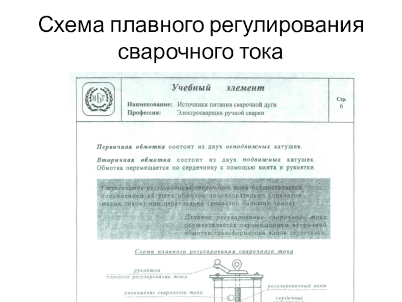 Плавное регулирование сварочного тока осуществляется перемещением вторичной обмотки трансформатора вдоль сердечника.
