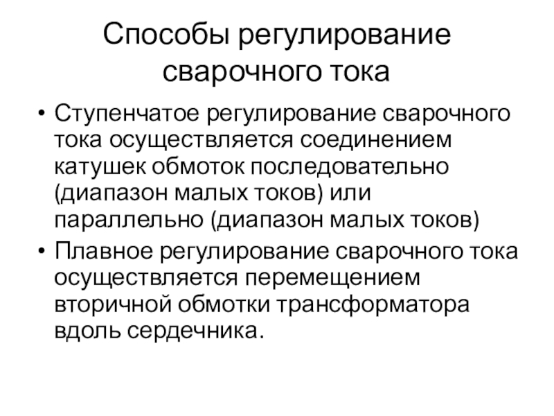 Способы регулирование сварочного токаСтупенчатое регулирование сварочного тока осуществляется соединением катушек обмоток последовательно(диапазон малых токов) или параллельно (диапазон