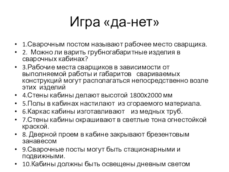 Игра «да-нет»1.Сварочным постом называют рабочее место сварщика.2. Можно ли варить грубногабаритные изделия в сварочных кабинах?3.Рабочие места сварщиков