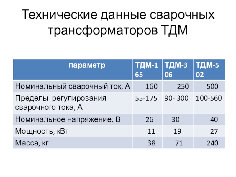 Слайд 12Технические данные сварочных трансформаторов ТДМ