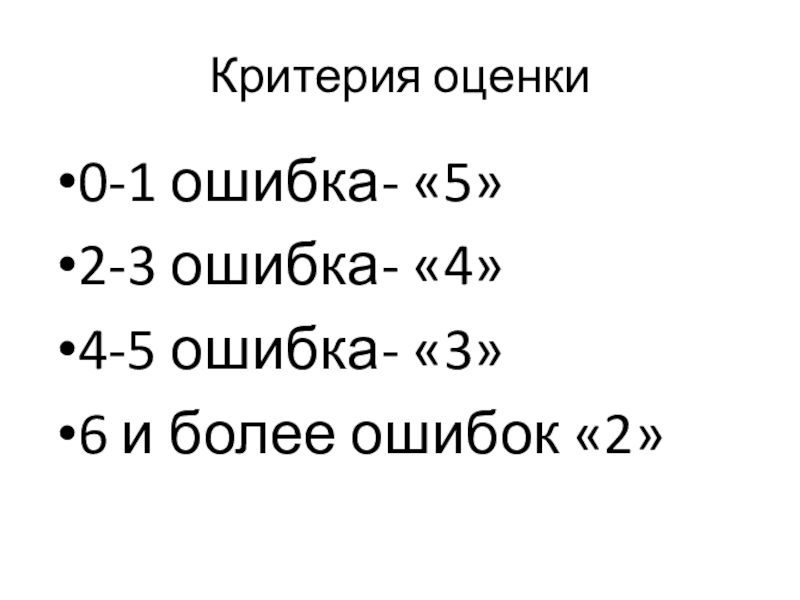 Критерия оценки0-1 ошибка- «5»2-3 ошибка- «4»4-5 ошибка- «3»6 и более ошибок «2»