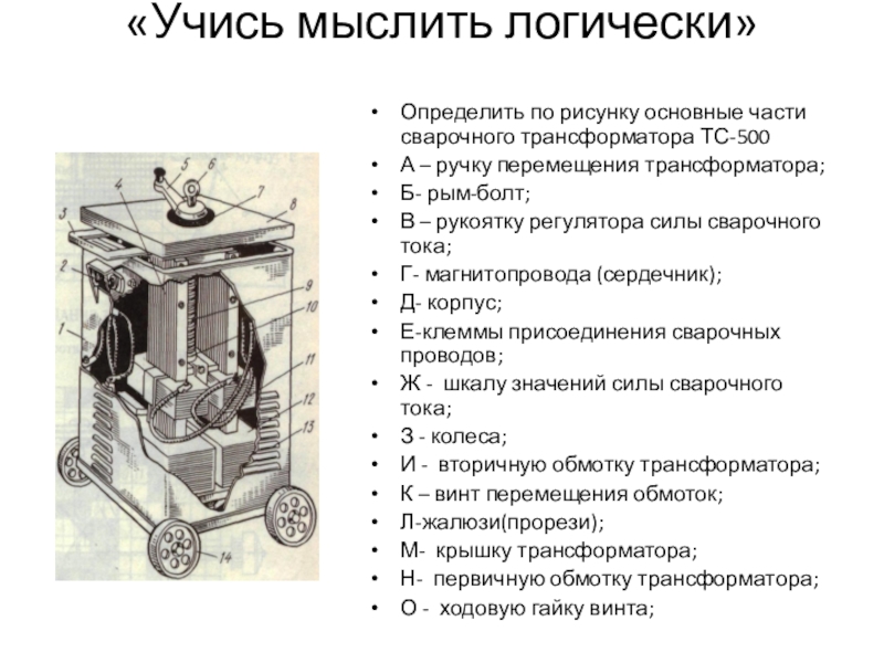 «Учись мыслить логически»  Определить по рисунку основные части сварочного трансформатора ТС-500А – ручку перемещения трансформатора;Б- рым-болт;В