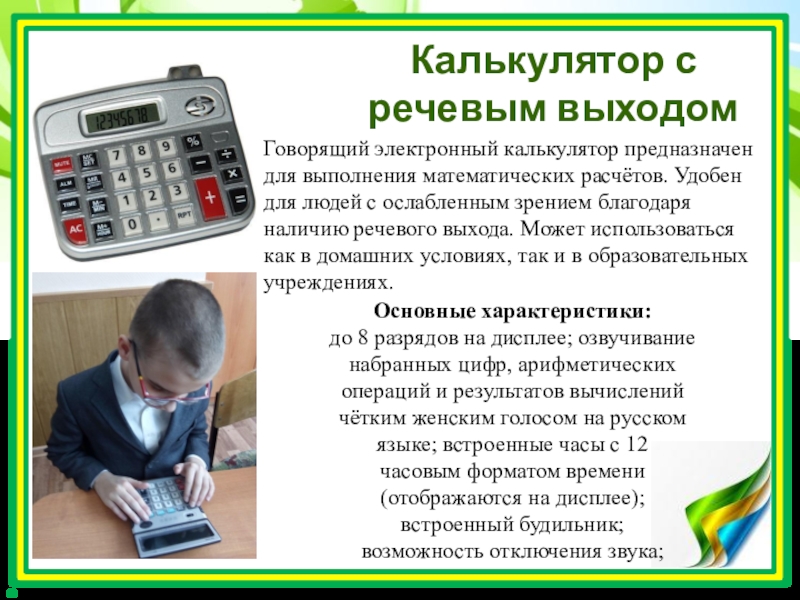 Говорящий электронный калькулятор предназначен для выполнения математических расчётов. Удобен для людей с ослабленным зрением благодаря наличию речевого выхода. Может использоваться как в домашних условиях, так и в образовательных учреждениях.