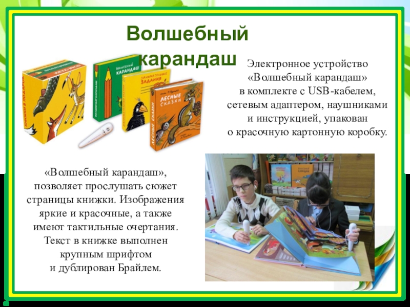 Электронное устройство «Волшебный карандаш» в комплекте с USB-кабелем, сетевым адаптером, наушниками и инструкцией, упакован о красочную картонную коробку.