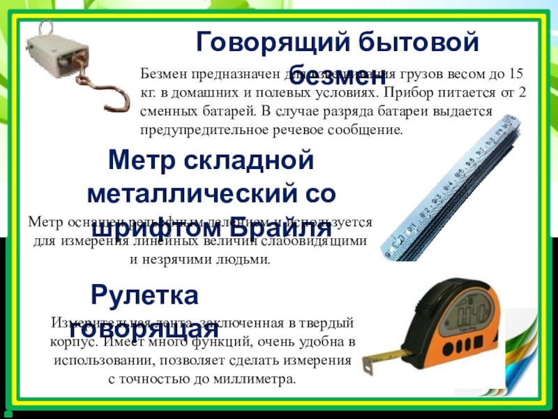 Метр оснащен рельефным делением и используется для измерения линейных величин слабовидящими
