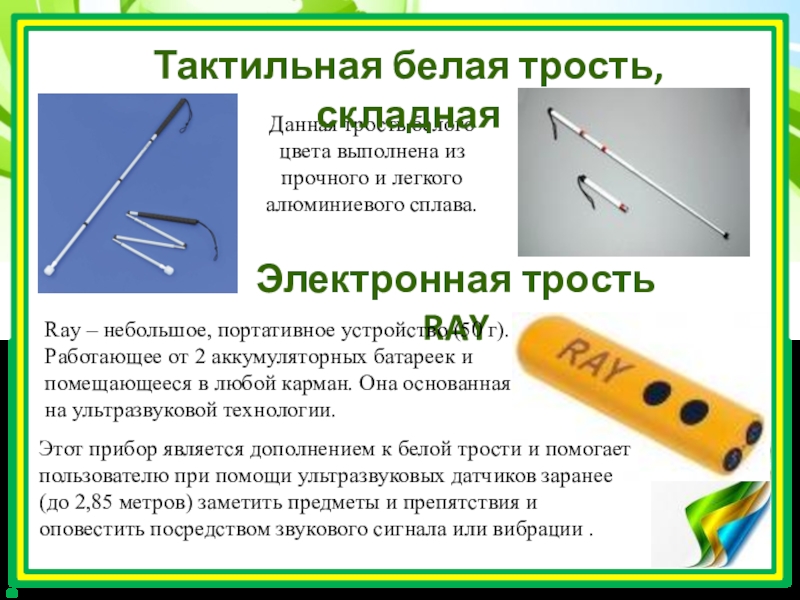 Этот прибор является дополнением к белой трости и помогает пользователю при помощи ультразвуковых датчиков заранее (до 2,85 метров) заметить предметы и препятствия и оповестить посредством звукового сигнала или вибрации .
