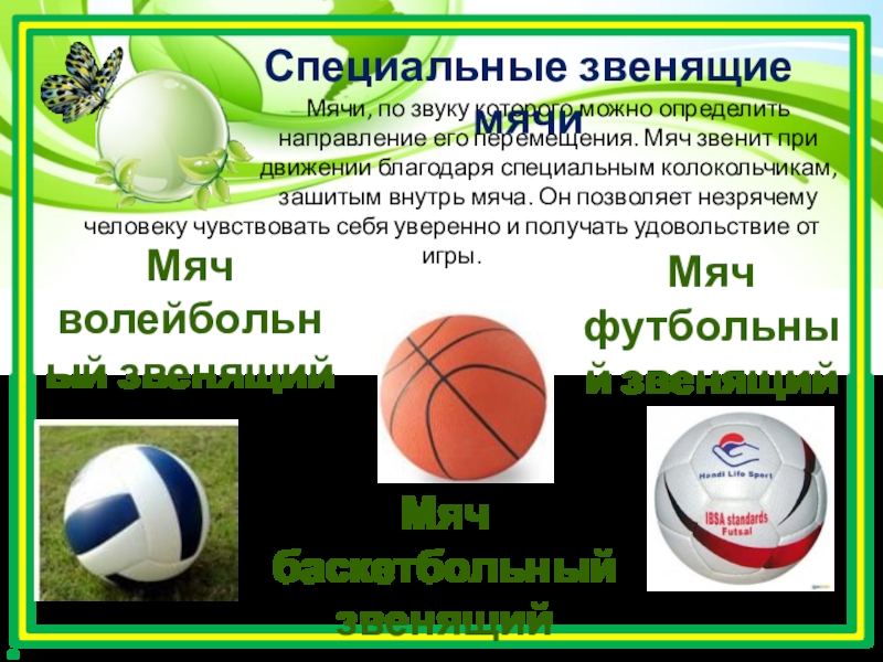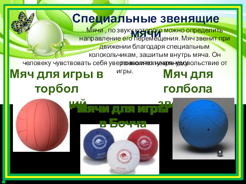 Мячи , по звуку которого можно определить направление его перемещения. Мяч звенит при движении благодаря специальным колокольчикам, зашитым внутрь мяча. Он позволяет незрячему