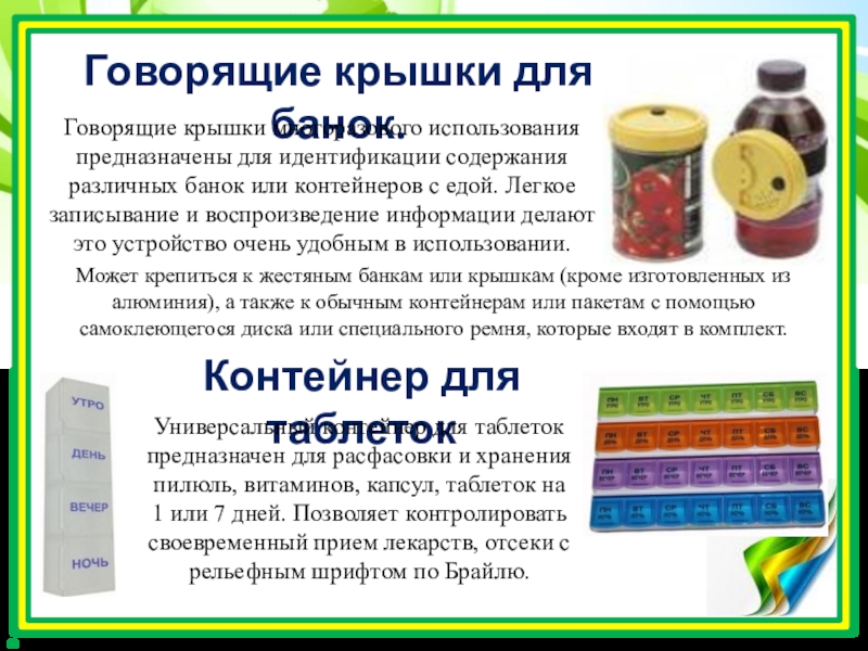 Универсальный контейнер для таблеток предназначен для расфасовки и хранения пилюль, витаминов, капсул, таблеток на 1 или 7 дней. Позволяет контролировать своевременный прием лекарств, отсеки с рельефным шрифтом по Брайлю.