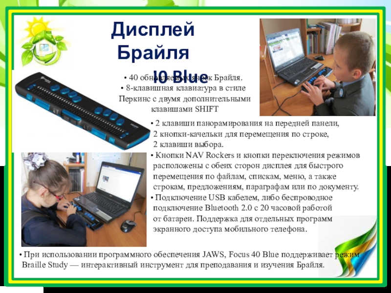 При использовании программного обеспечения JAWS, Focus 40 Blue поддерживает режим Braille Study — интерактивный инструмент для преподавания и изучения Брайля.