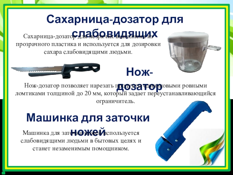 Машинка для заточки ножей используется слабовидящими людьми в бытовых целях и станет незаменимым помощником.