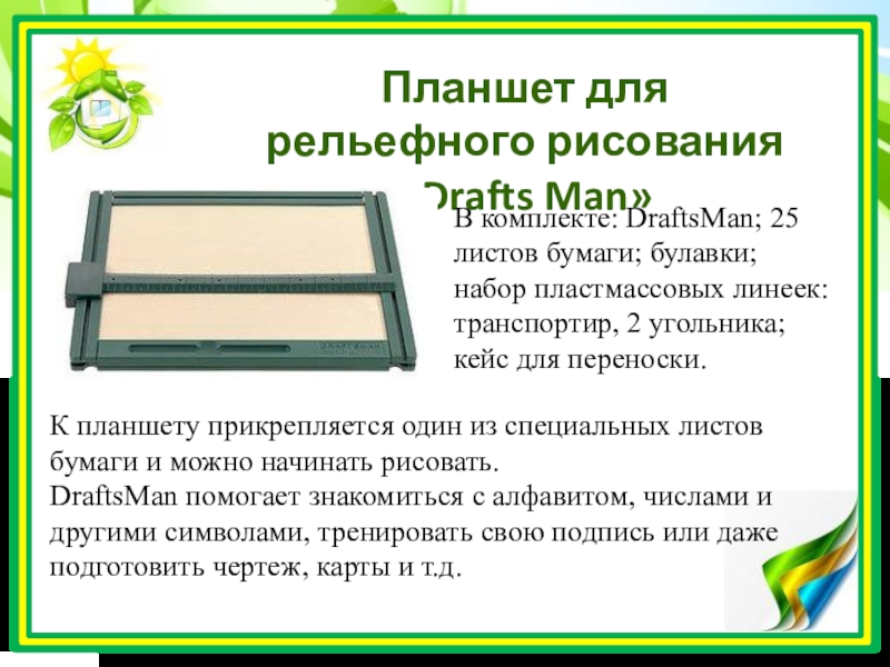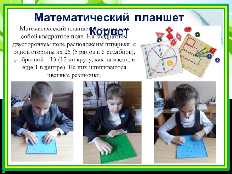Математический планшет представляет собой квадратное поле с нанесенной координатной сеткой. В 33 точках сетки установлены пластмассовые гвоздики (цвета радуги, черный и белый); резинка трех цветов; альбом схем.