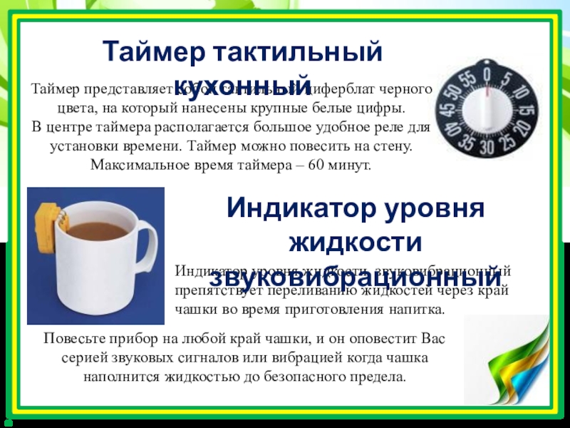 Повесьте прибор на любой край чашки, и он оповестит Вас серией звуковых сигналов или вибрацией когда чашка наполнится жидкостью до безопасного предела.