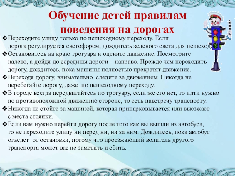 Переходя дорогу, внимательно следите за движением. Никогда не перебегайте дорогу, даже по пешеходному переходу.