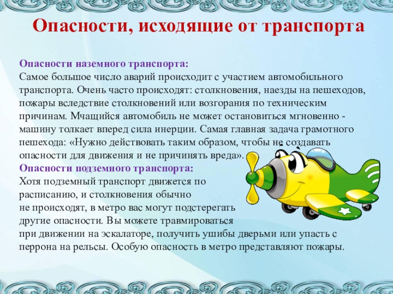 участием автомобильного транспорта. Очень часто происходят: столкновения, наезды на пешеходов, пожары вследствие столкновений или возгорания по техническим причинам. Мчащийся автомобиль не может остановиться мгновенно - машину толкает вперед сила инерции. Самая главная задача грамотного пешехода: «Нужно действовать таким образом, чтобы не создавать опасности для движения и не причинять вреда».