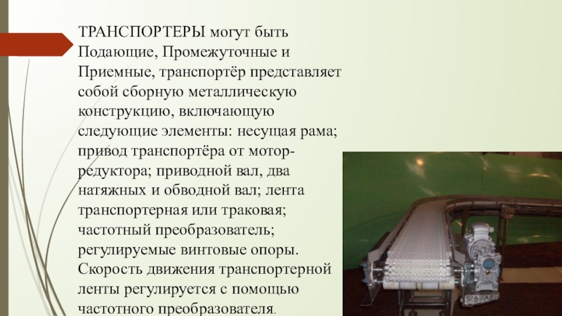 Слайд 17ТРАНСПОРТЕРЫ могут быть Подающие, Промежуточные и Приемные, транспортёр представляет собой сборную