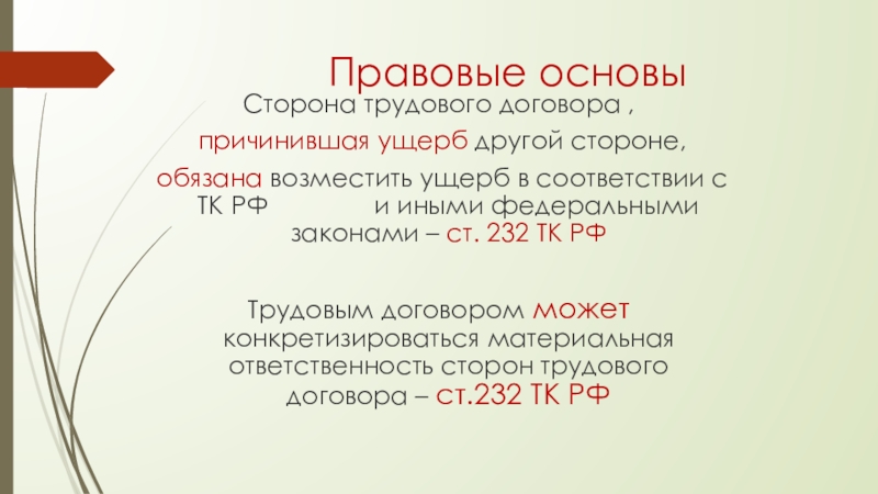 возместить ущерб в соответствии с ТК РФ и иными федеральными законами – ст. 232 ТК РФ