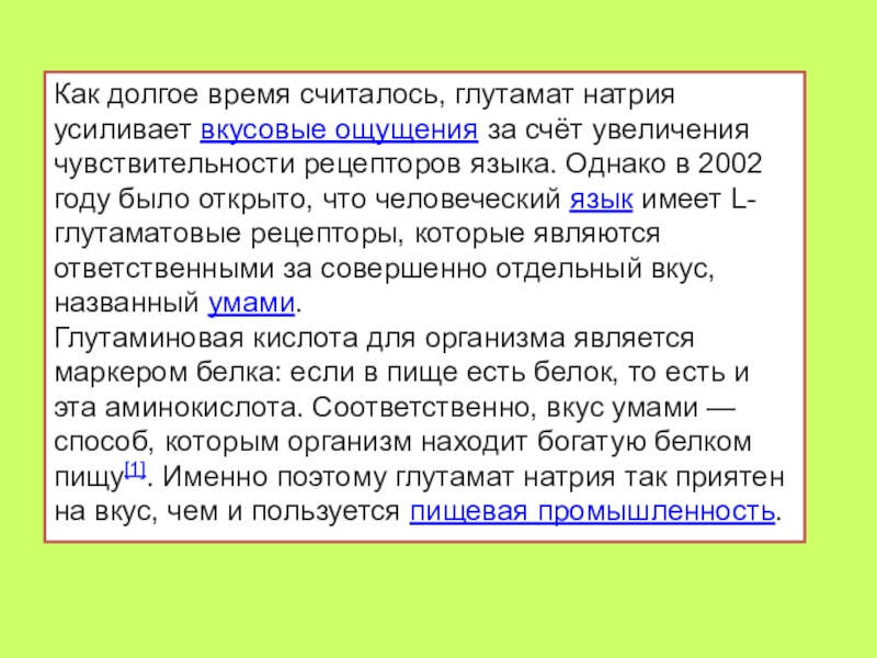 Слайд 28Как долгое время считалось, глутамат натрия усиливает вкусовые ощущения за счёт увеличения чувствительности