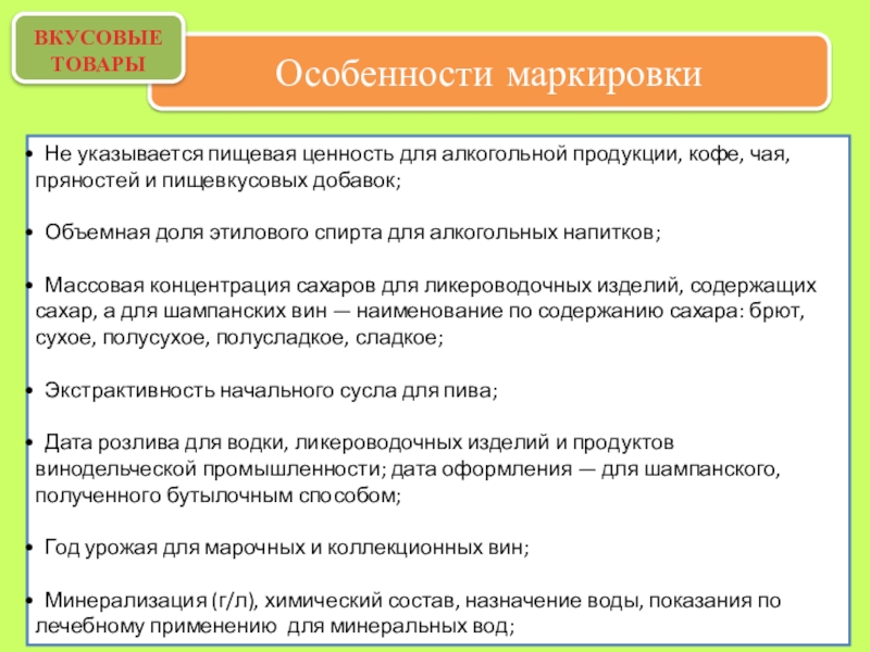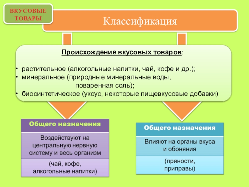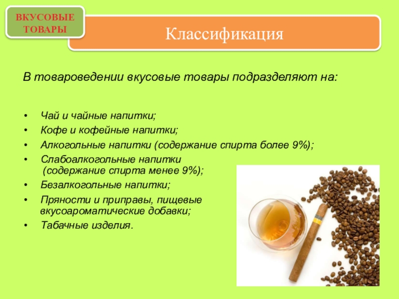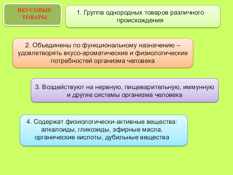 Вкусовые товары удовлетворяют потребность организма в определенных вкусовых ощущениях, возбуждают аппетит.