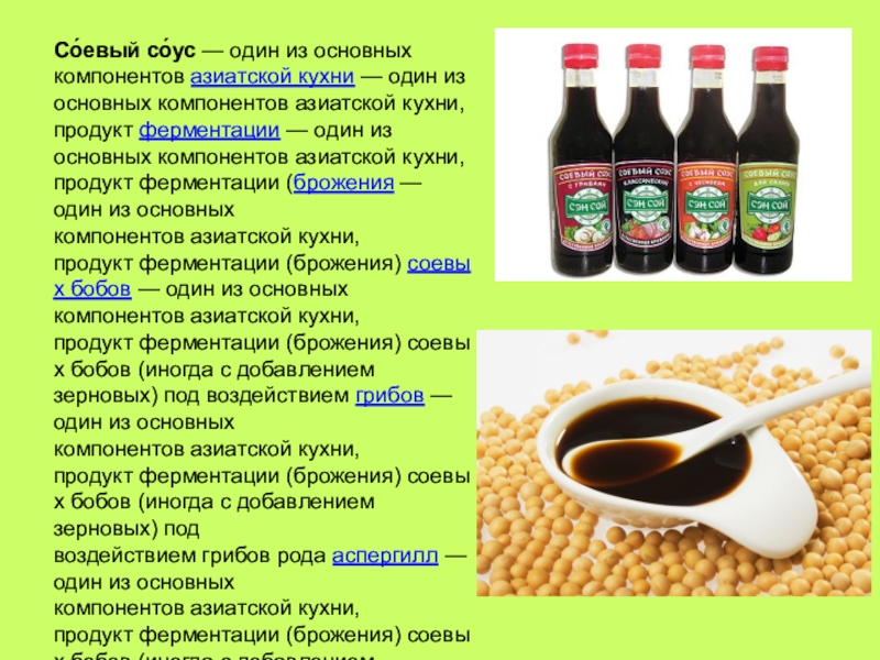 кухни, продукт ферментации — один из основных компонентов азиатской кухни, продукт ферментации (брожения — один из основных компонентов азиатской кухни, продукт ферментации (брожения) соевых бобов — один из основных компонентов азиатской кухни, продукт ферментации (брожения) соевых бобов (иногда с добавлением зерновых) под воздействием грибов — один из основных компонентов азиатской кухни, продукт ферментации (брожения) соевых бобов (иногда с добавлением зерновых) под воздействием грибов рода аспергилл — один из основных компонентов азиатской кухни, продукт ферментации (брожения) соевых бобов (иногда с добавлением зерновых) под воздействием грибов рода аспергилл. Представляет собой жидкость очень тёмного цвета с характерным резким запахом. Содержит множество минеральных элементов, витаминов — один из основных компонентов азиатской кухни, продукт ферментации (брожения) соевых бобов (иногда с добавлением зерновых) под воздействием грибов рода аспергилл. Представляет собой жидкость очень тёмного цвета с характерным резким запахом. Содержит множество минеральных элементов, витаминов иаминокислот. За счёт присутствия производных глутаминовой кислоты обладает свойством ярко подчёркивать вкус блюд. На основе соевого соуса готовится популярный японский соус для тэрияки. Любой из рецептов тэрияки включает в себя соевый соус как основу и сахар. Используется для приготовления говядины, мяса птиц и рыбы на гриле. Продукты приобретают характерную «глазурь» и яркий вкус.