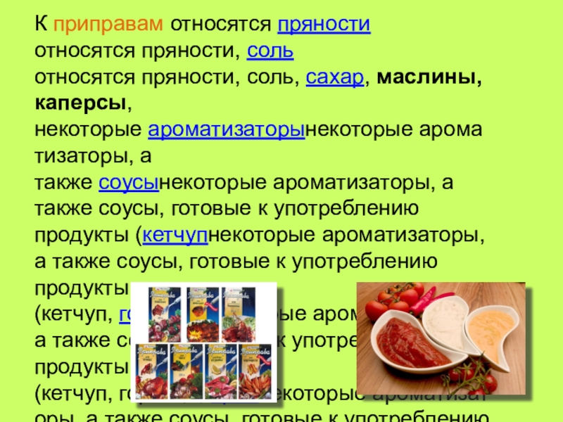 Слайд 20К приправам относятся пряности относятся пряности, соль относятся пряности, соль, сахар, маслины, каперсы, некоторые ароматизаторынекоторые ароматизаторы, а также соусынекоторые ароматизаторы, а