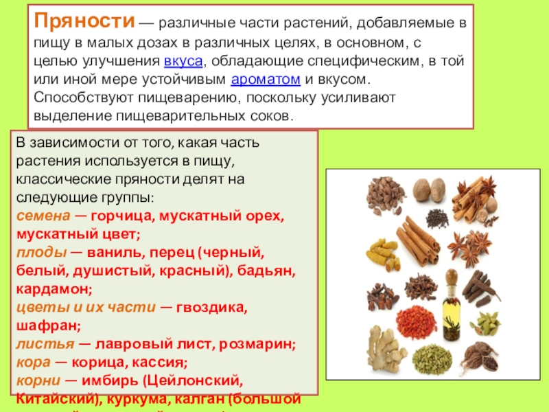 Слайд 19Пряности — различные части растений, добавляемые в пищу в малых дозах в