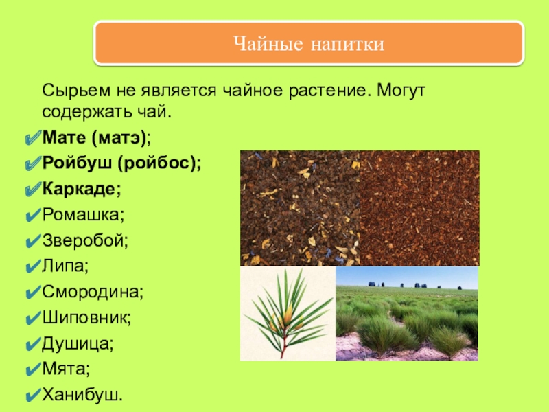 Слайд 16Сырьем не является чайное растение. Могут содержать чай.