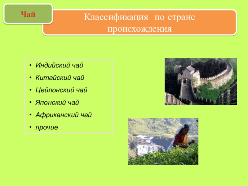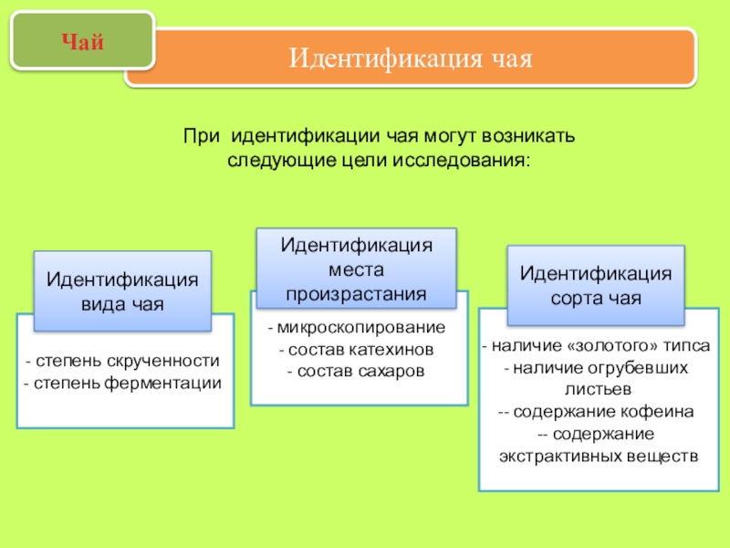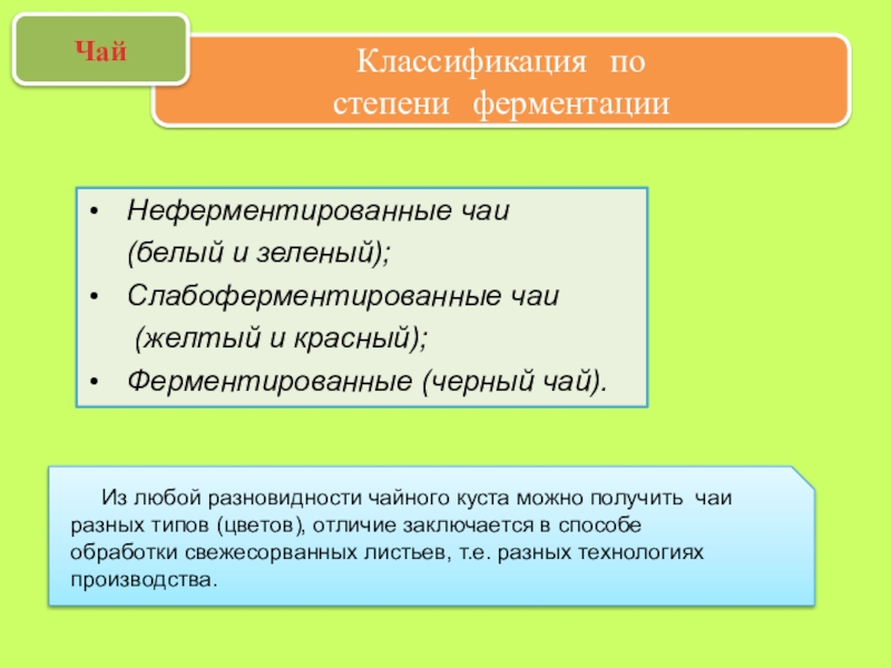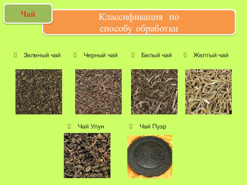 Из любой разновидности чайного куста можно получить чаи разных типов (цветов), отличие заключается в способе обработки свежесорванных листьев, т.е. разных технологиях производства.