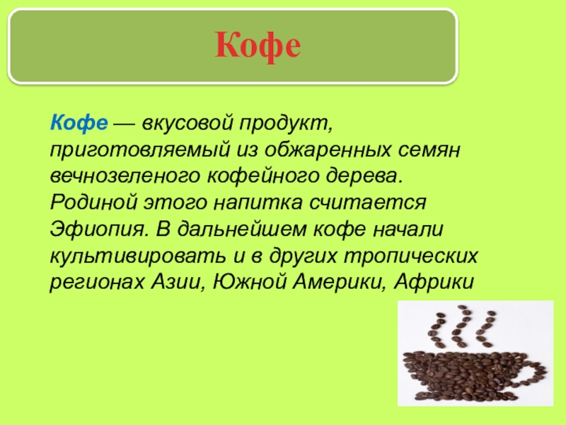 Кофе — вкусовой продукт, приготовляемый из обжаренных семян вечнозеленого кофейного дерева.