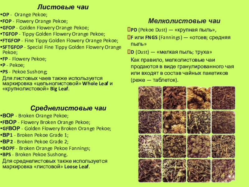 Байховый (листовой, ломаный, гранулированный, высевки, крошка);