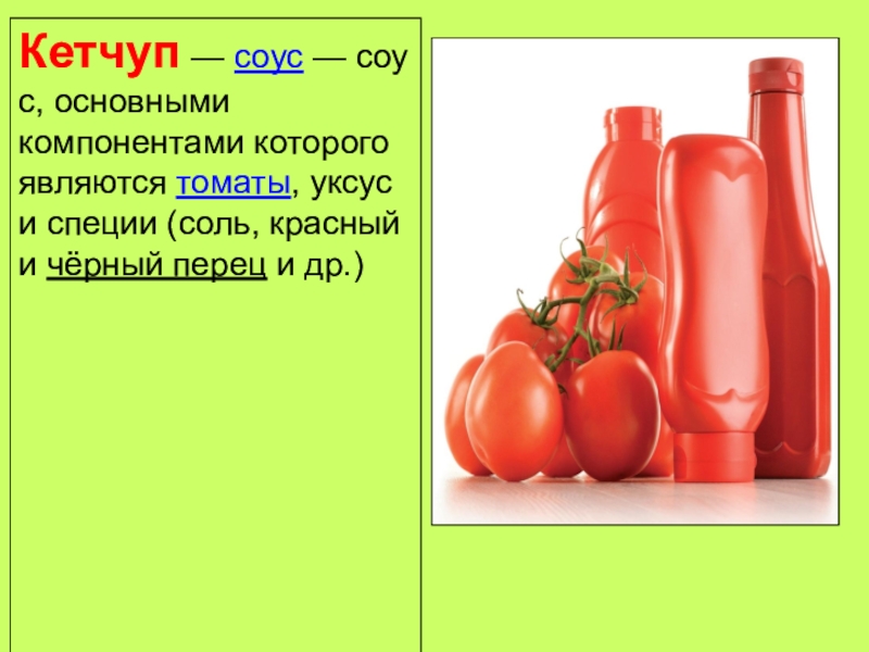 Слайд 22Кетчуп — соус — соус, основными компонентами которого являются томаты, уксус и специи (соль, красный и чёрный перец и др.)
