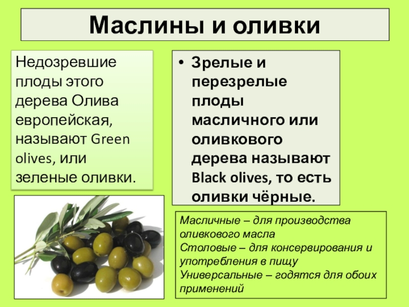 Недозревшие плоды этого дерева Олива европейская, называют Green olives, или зеленые оливки.