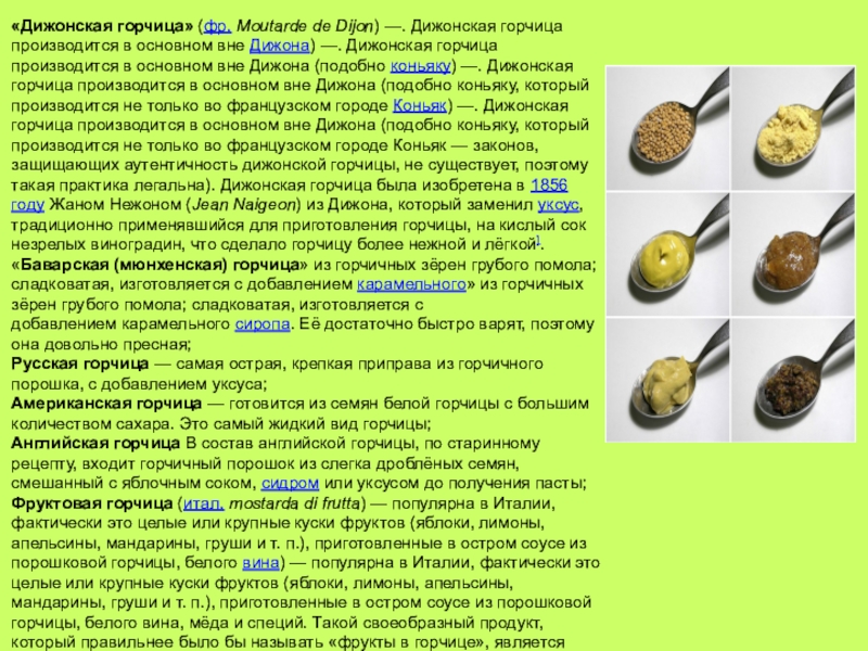 Слайд 25«Дижонская горчица» (фр. Moutarde de Dijon) —. Дижонская горчица производится в основном вне Дижона) —. Дижонская