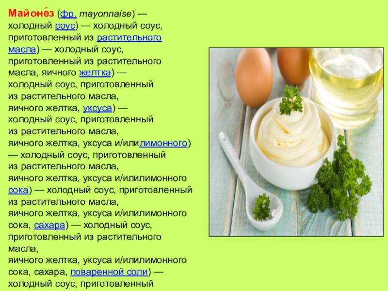 Слайд 21Майоне́з (фр. mayonnaise) — холодный соус) — холодный соус, приготовленный из растительного масла) — холодный соус, приготовленный из растительного масла, яичного желтка) —