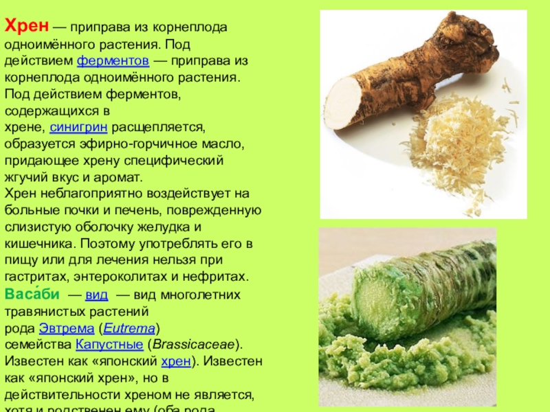 Слайд 26Хрен — приправа из корнеплода одноимённого растения. Под действием ферментов — приправа