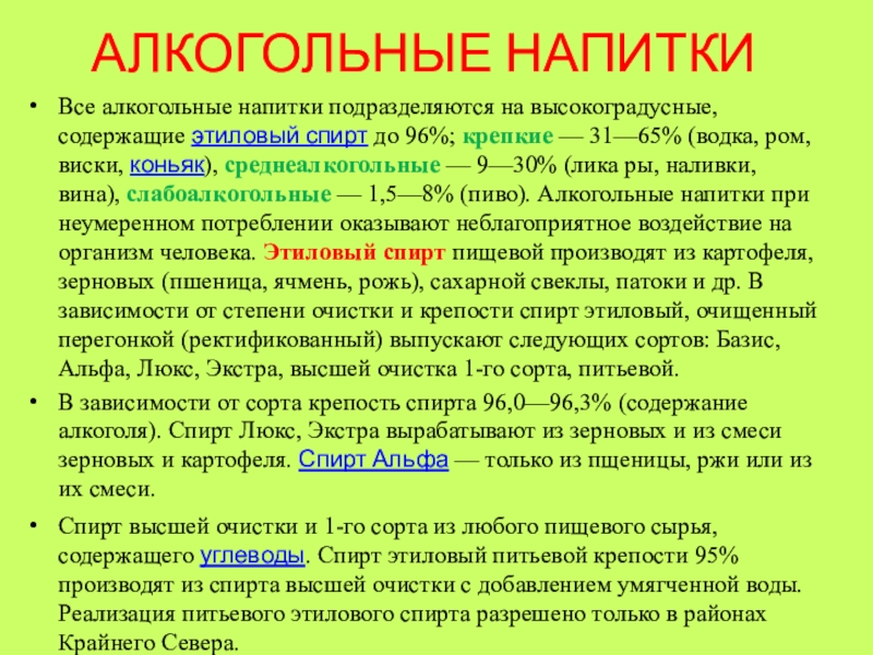 Все алкогольные напитки подразделяются на высокоградусные, содержащие этиловый спирт до 96%; крепкие